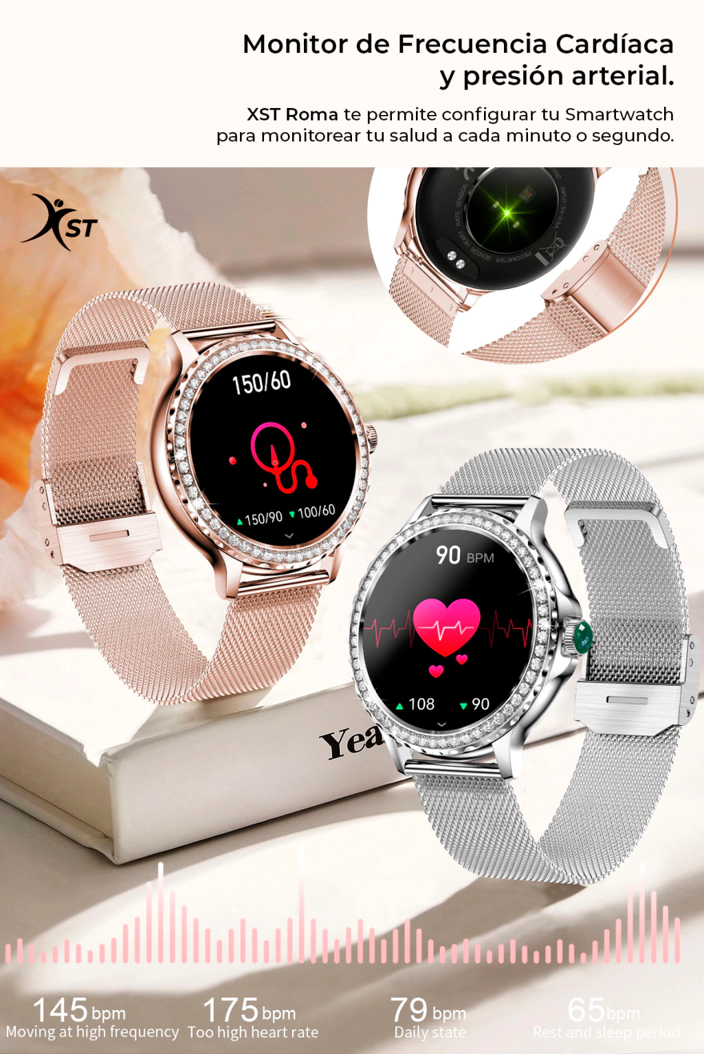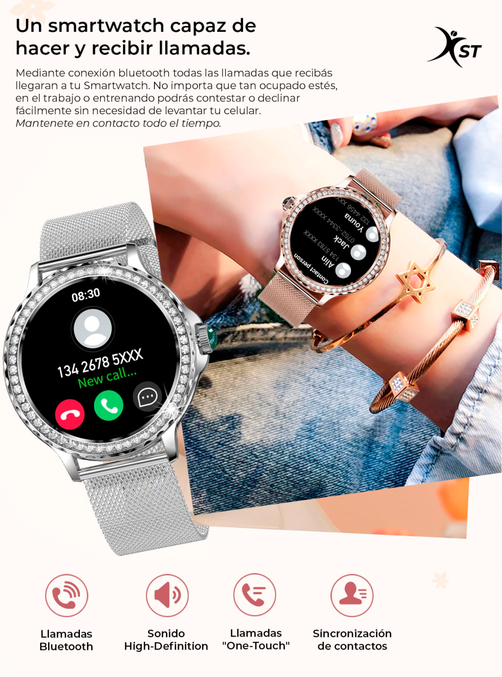 Ciclo mestrual,Frecuencia cardiaca,Llamadas,Notifiaciones de app,Presión arterial,Recuento de pasos,registro de datos de ejercicio.,saturación de oxígeno,sueño |